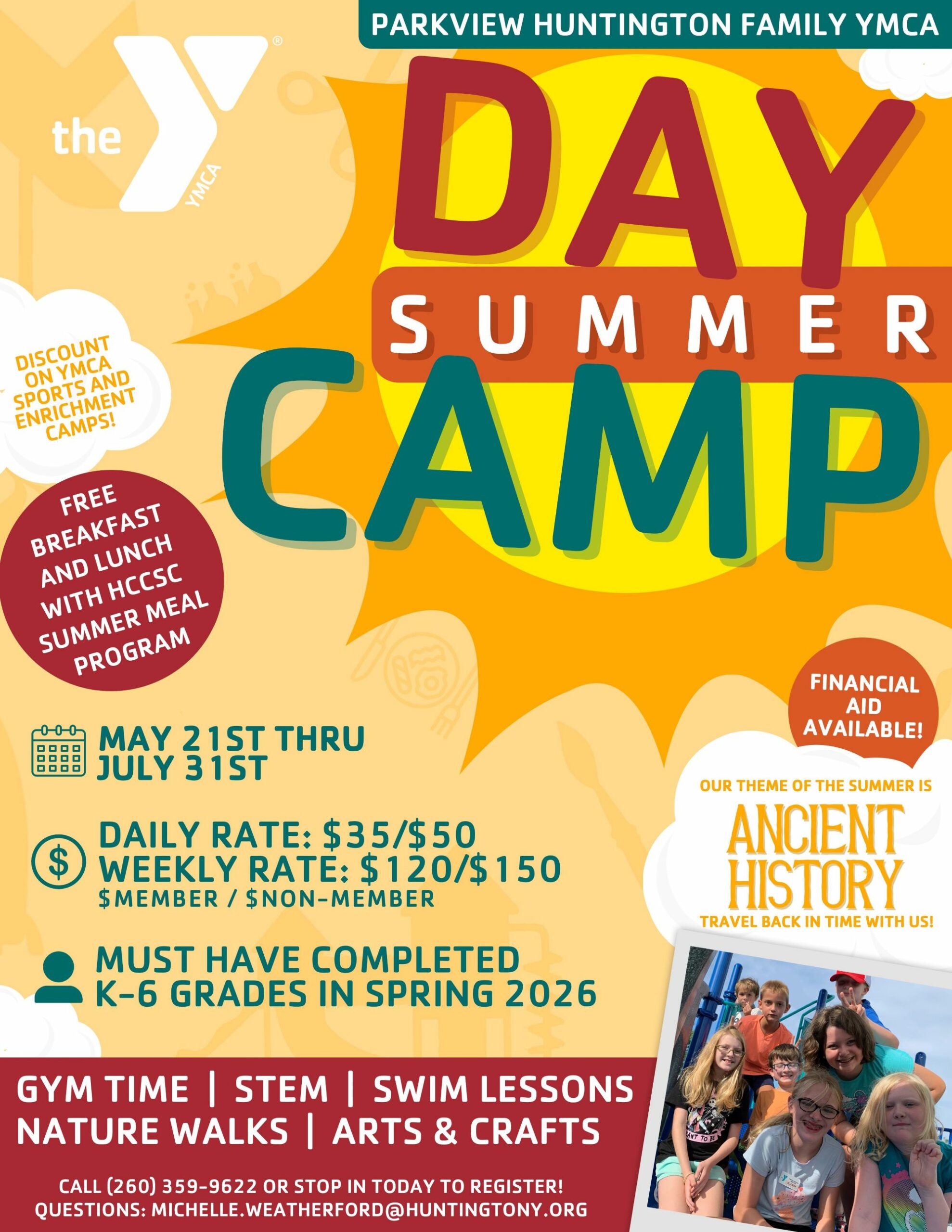 Contact Michelle Weatherford with questions about day camp programs: michelle.weatherford@huntingtony.org and contact Shanon Spaulding about enrichment camps: shanon.spaulding@huntingtony.org or call the YMCA (260)359-9622
