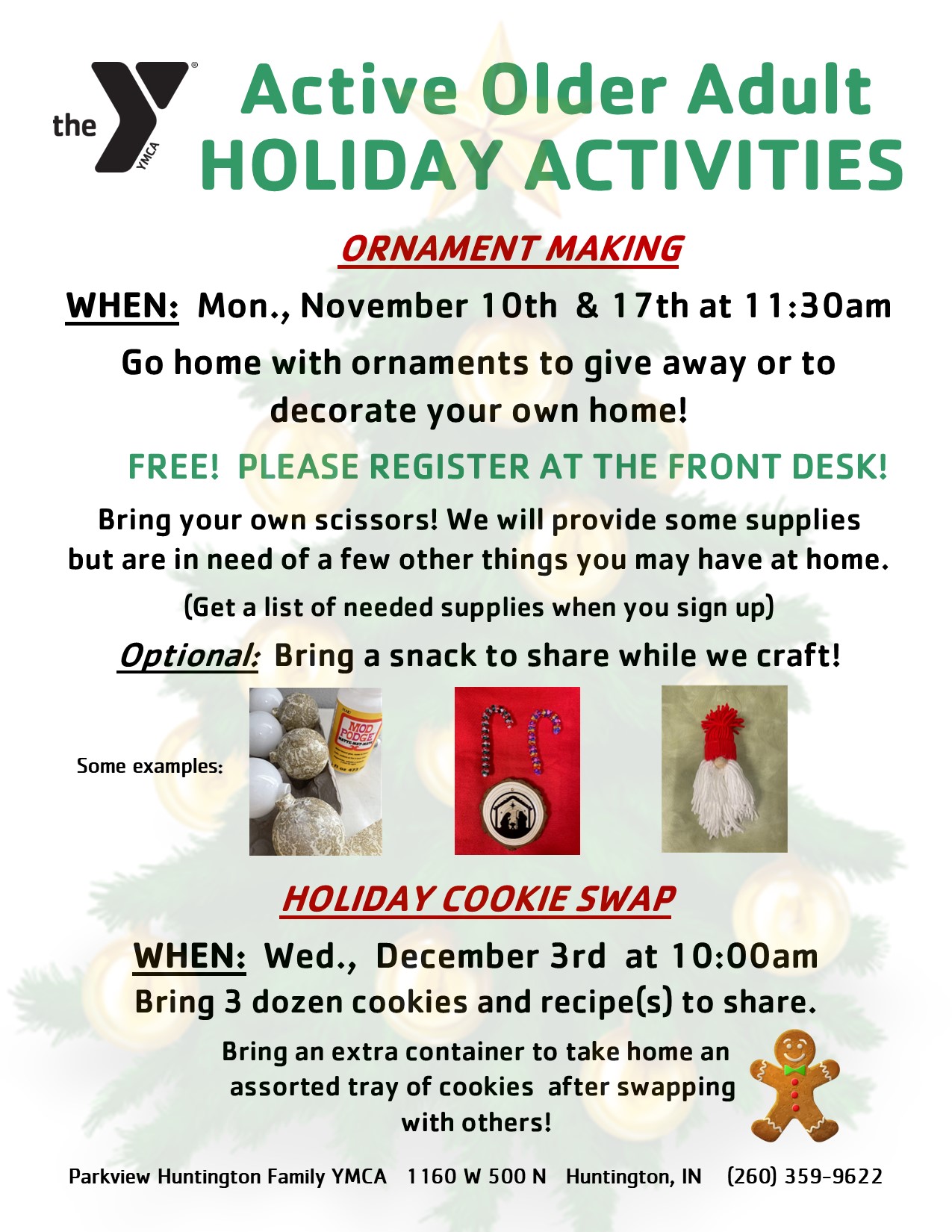 | November 10 &17 11:30am | YMCA | Ornament Making | Join us for some fun & easy ornament making for gifts or use at your home! FREE to join. Register at front desk. | Flyer |