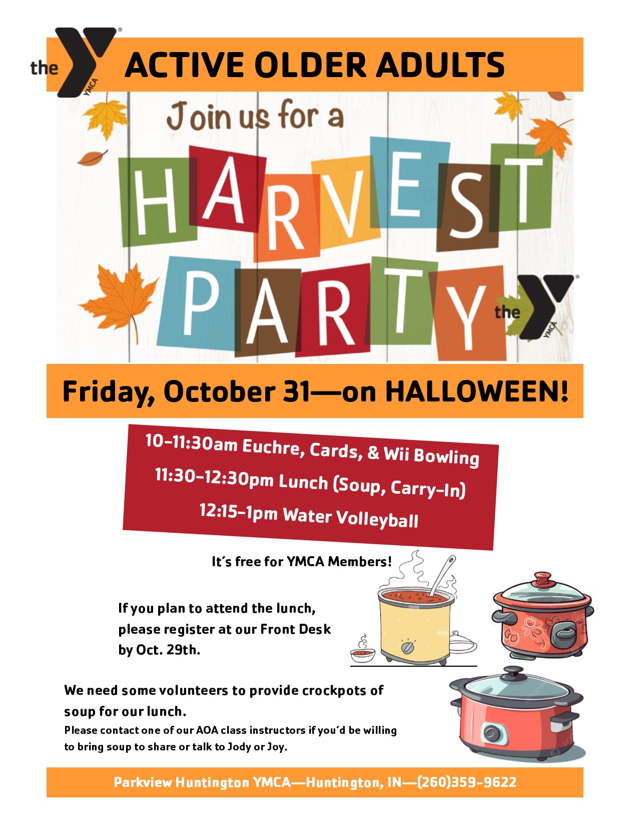 OCT 31st at 11:30am: ANNUAL AOA HARVEST PARTY. Celebrate fall with our YMCA community. Join in the activities before and after to make it a morning and lunch! Sign up to share a soup too! Read the flyer HERE.