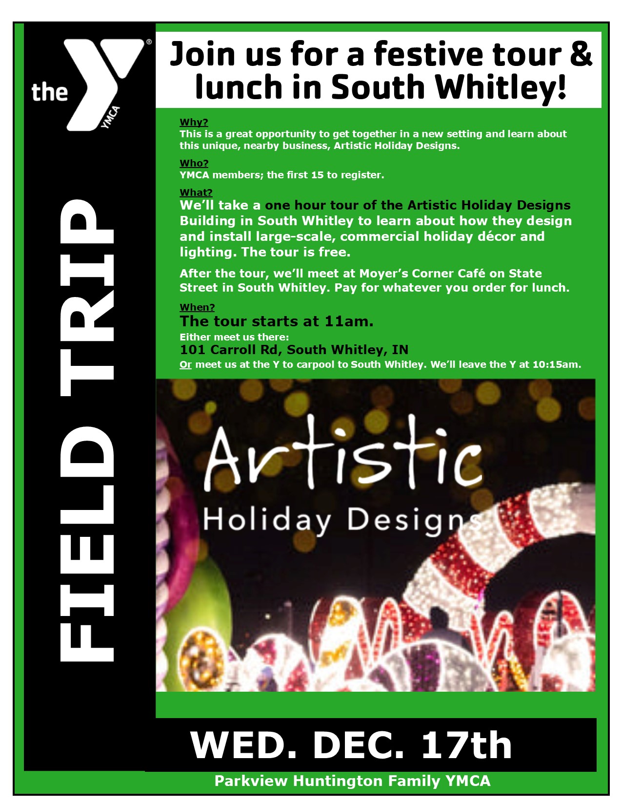 | December 17 @10:15am at Y or 11am at tour | South Whitley | Festive tour field trip & lunch | Head to South Whitley to tour Artistic Holiday Designs and go to lunch at Moyer’s Corner Cafe’ | Flyer |