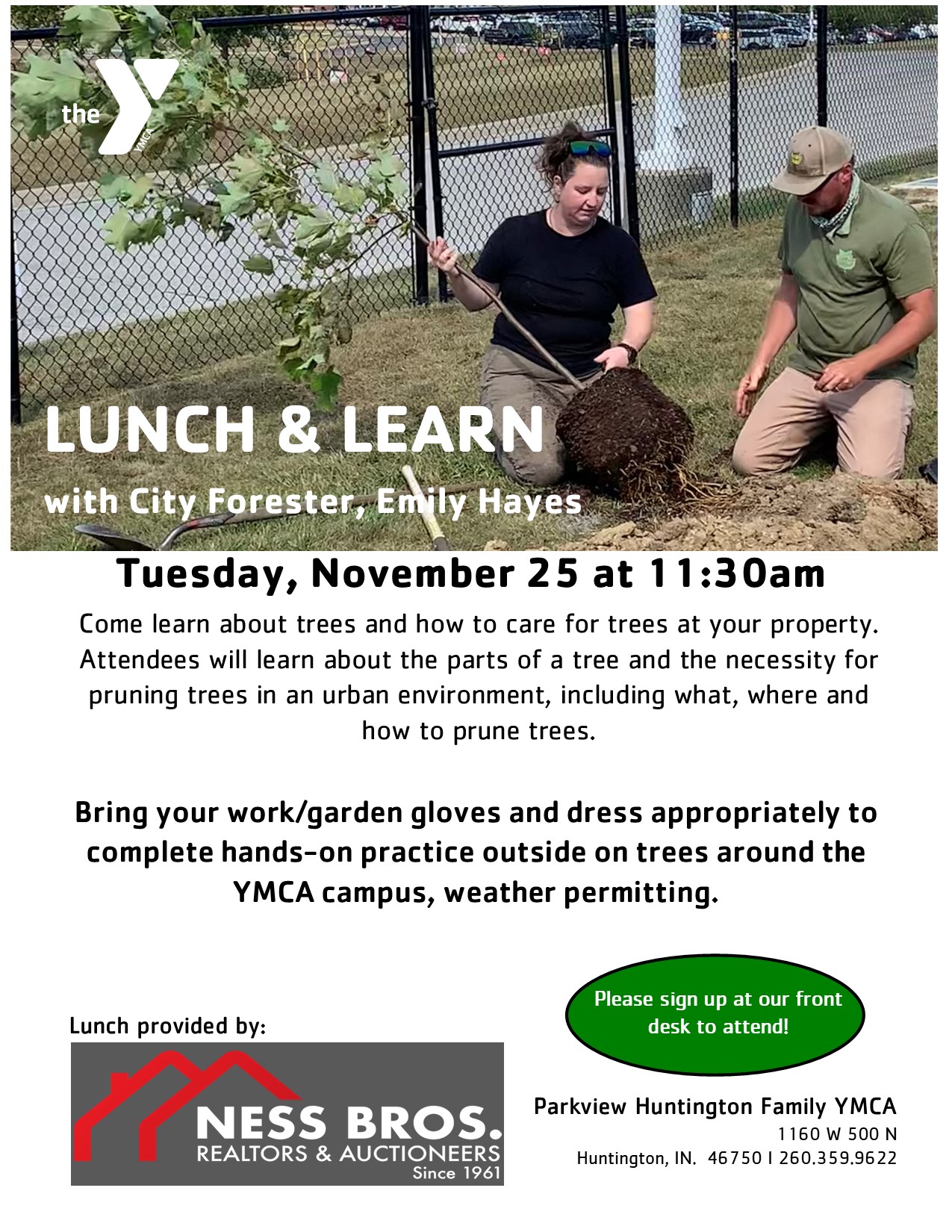 | November 25 @ 11:30am | YMCA | Tree care & pruning Lunch & Learn | Join City Forester, Emily as we learn about parts of trees and how to prune trees, including the what, where, and how to prune trees. Dress for the weather and to do some hands-on work on trees. | Flyer |