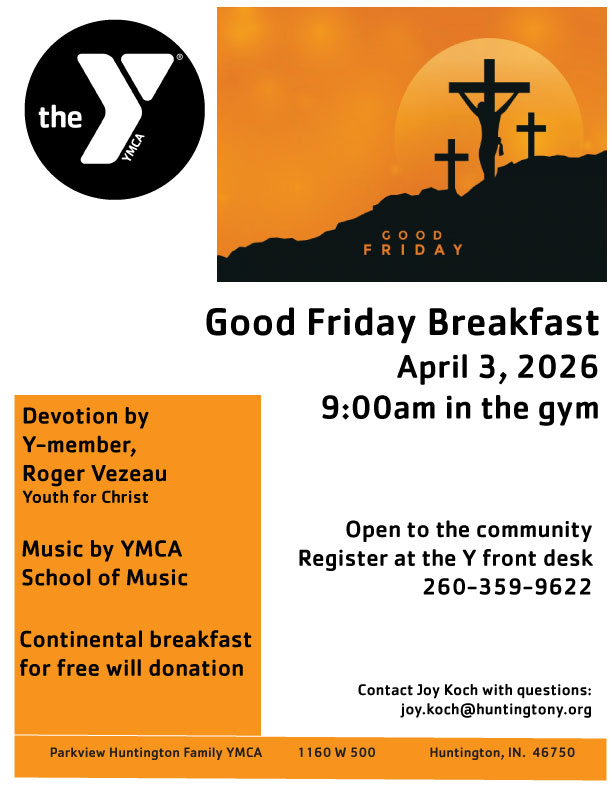 | Friday, April 3 at 9am | YMCA gymnasium | Good Friday Breakfast | Come hear reflections about Easter and enjoy breakfast together. REGISTRATION IS REQURED & open March 1. | Flyer |