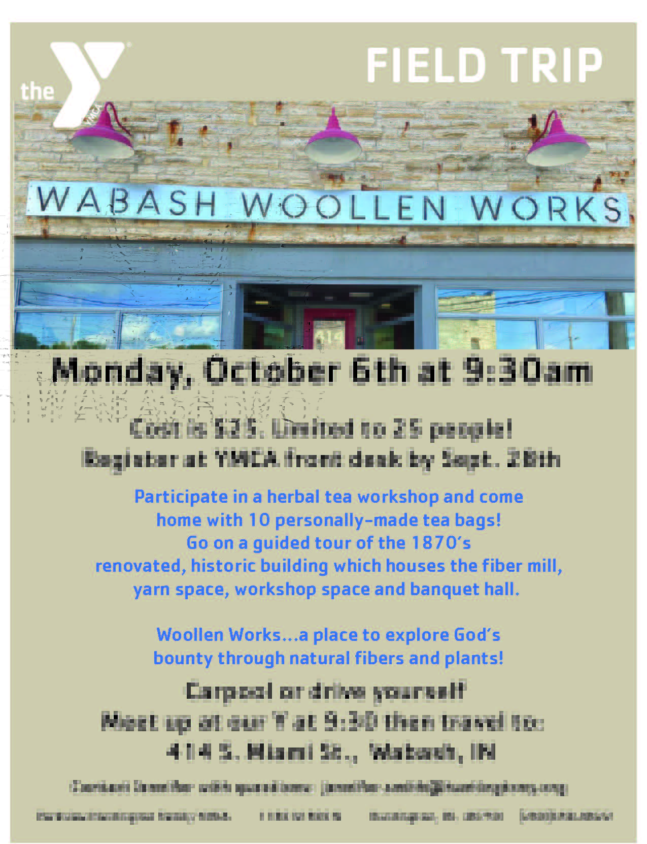 OCT 6th 9:30am: WOOLLEN WORKS FIELD TRIP & HERBAL TEA WORKSHOP ($25). Meet at our Y to carpool with friends to Wabash Woollen Works located at 414 S. Miami St., Wabash. Attend the herbal tea workshop (2hrs), bring home your homemade tea bags and tour the historic, renovated fiber mill! See flyer HERE.